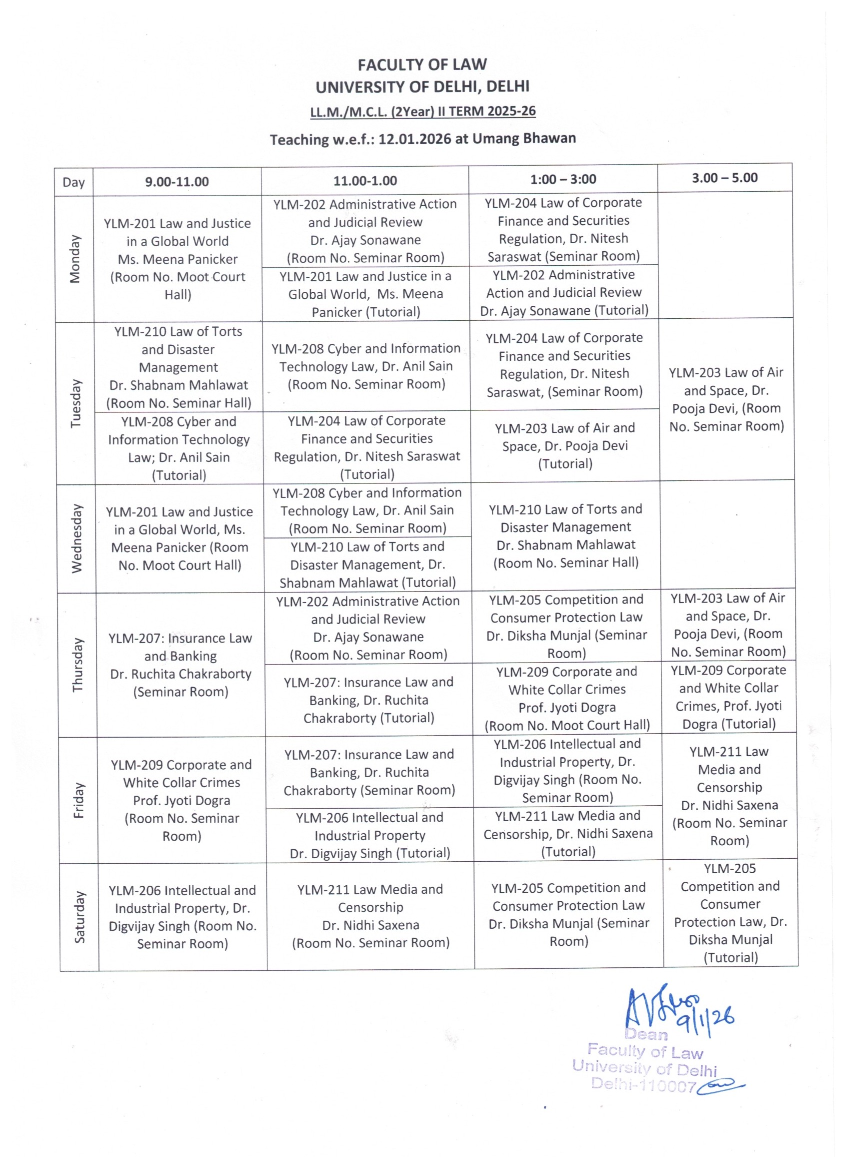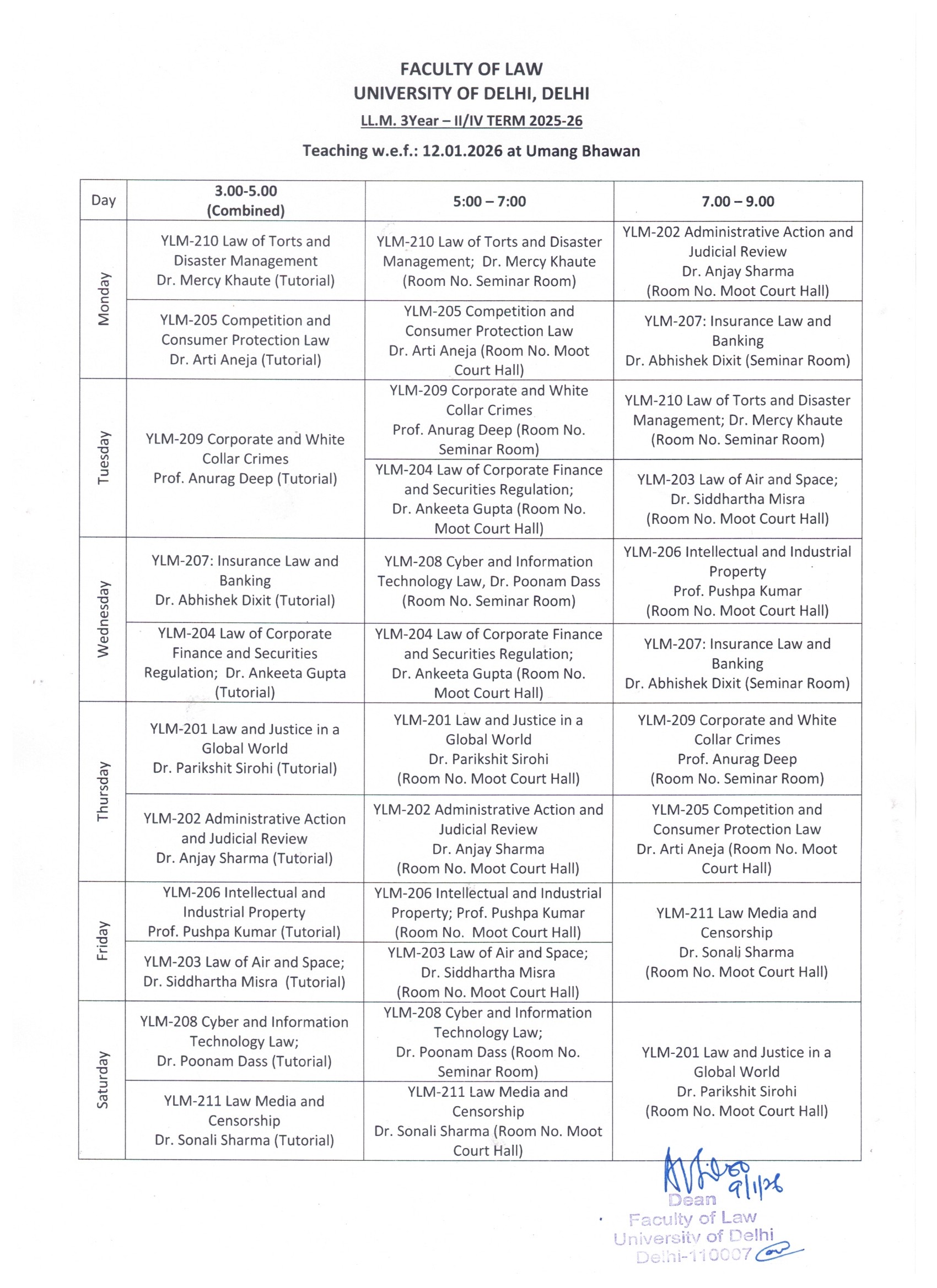 - LL.M. 2 Year - Ist Semester Revised Time Table