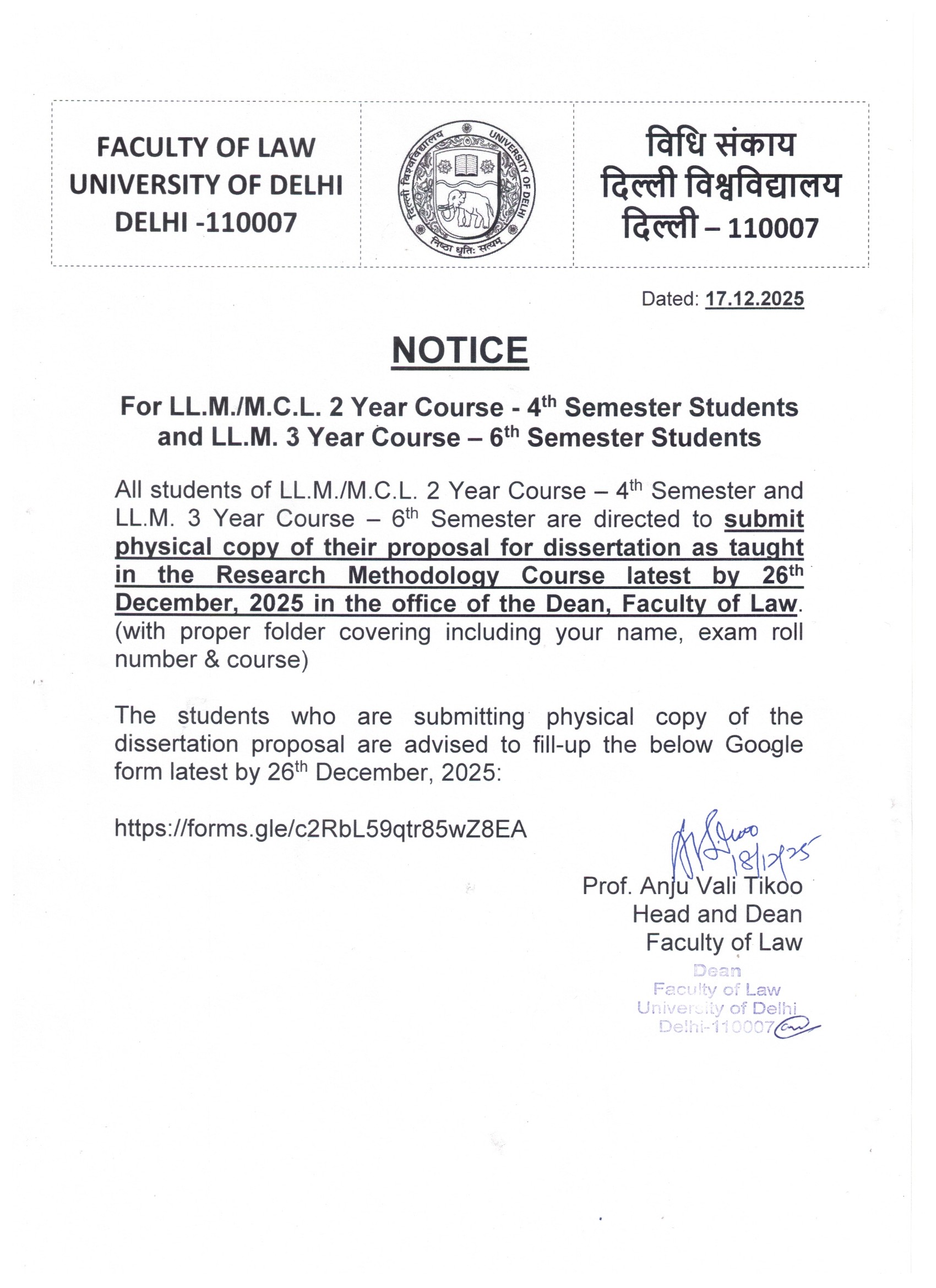 - Notice for LLM Students regarding Dissertation Proposal